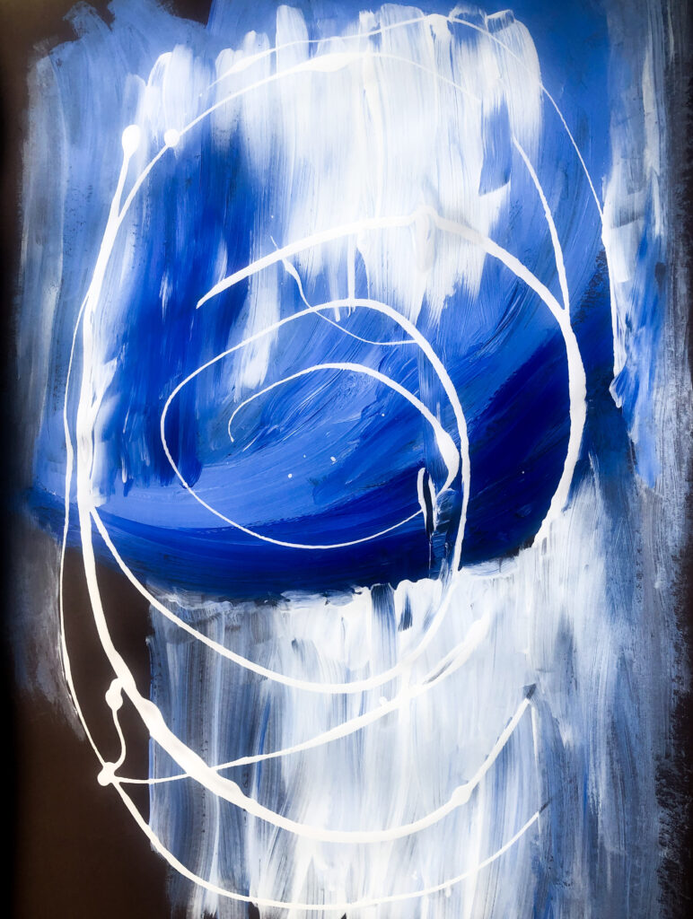 juicy acrylic blues on brown paper, the vertical comes up against the blue wave, there’s a back and forth, the spiral seals the deal, the original disappeared