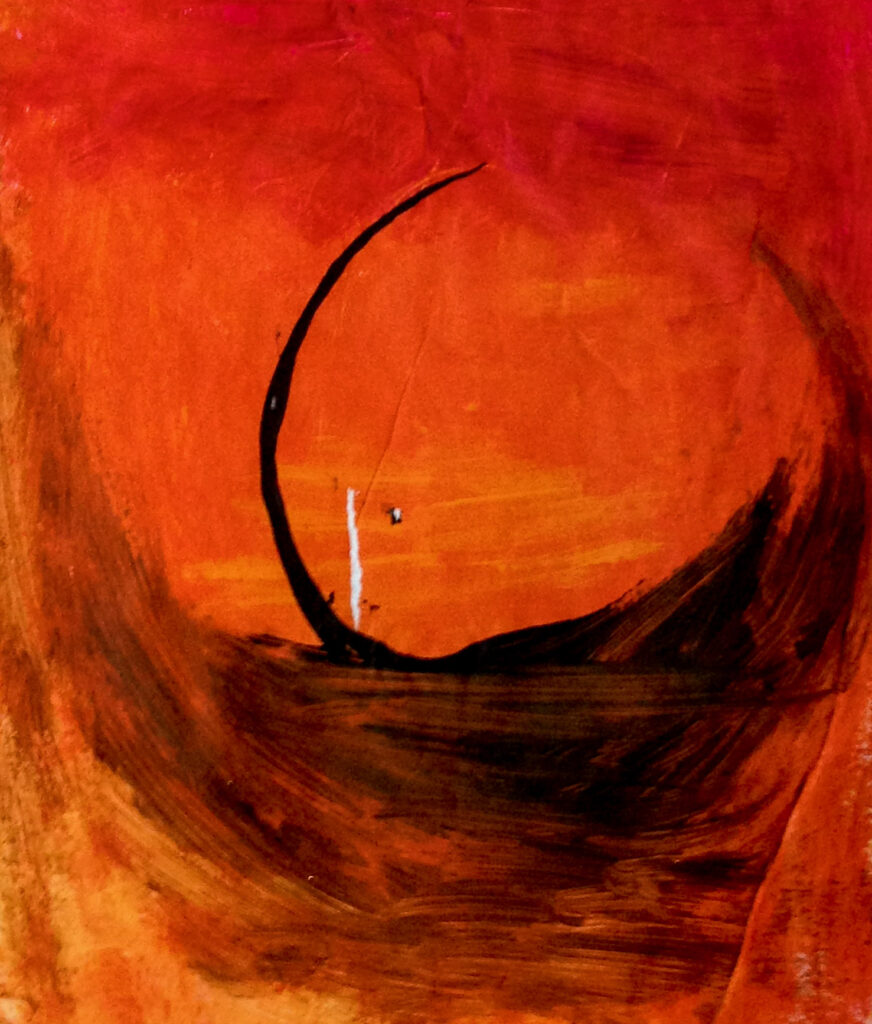 acrylic and ink. the moon becomes a boat, maybe, and the paper cracks, vertically, to let white light in