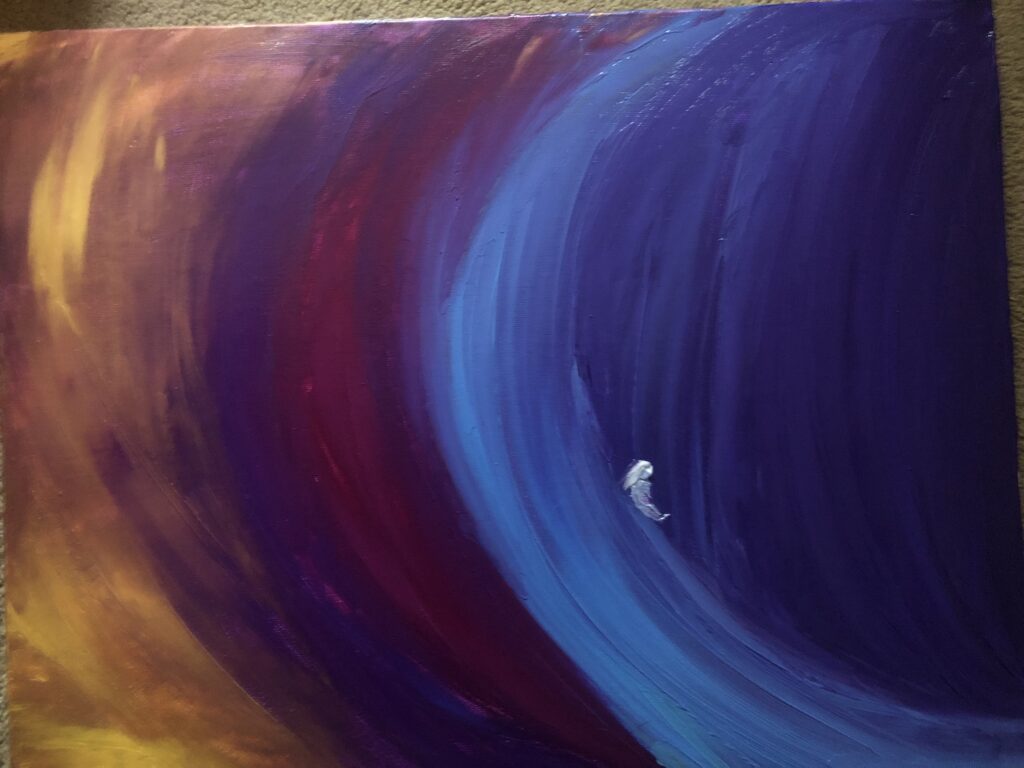 Sarah painted The Comet using her phenomenal intuitive painting process in collaboration with me tapping into my felt sense of what might serve my creativity. I found the whole process to be revelatory. I gave Sarah a short list of colors that gave me a tingly, “that’s it!” feeling. We touched base back and forth, adding a bit more of this color or that, always tuning into that felt sense as a kind of north star.
