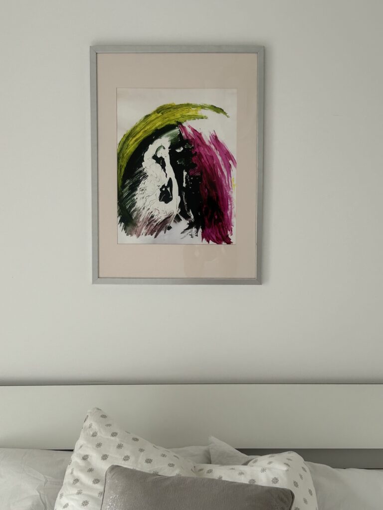 I love the sweet, peaceful energy this painting brings to the room where I sleep, and I love that it’s there when I wake, a blessing of colour just over my head.