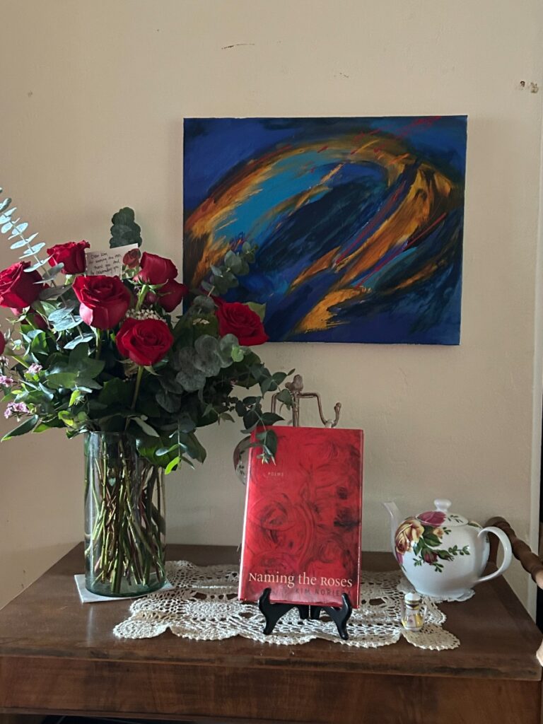 ‘the comet’ and ‘naming the roses’, book cover for ‘Naming the Roses’ by Kim Noriega (AIM Higher, 2024)
